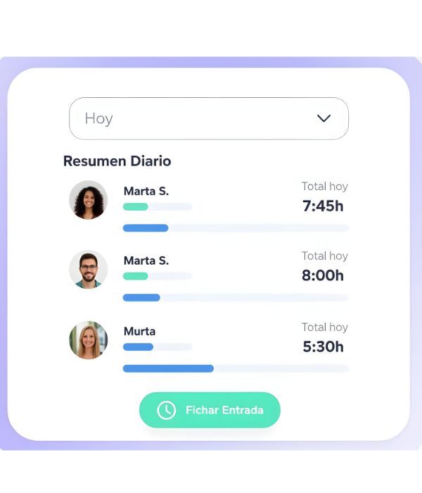 Supervisas quién ha fichado, incidencias y posibles retrasos o ausencias.